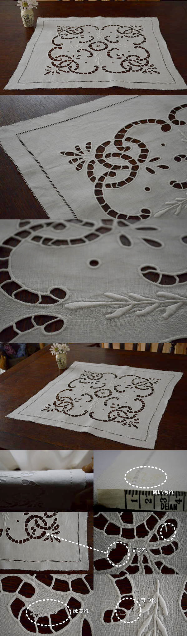 風合いの良い少し生成りの麻生地に、丁寧な手刺繍が素敵なアンティークリネンクロスです♪ ※軽く、漂白・洗濯済みです。