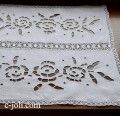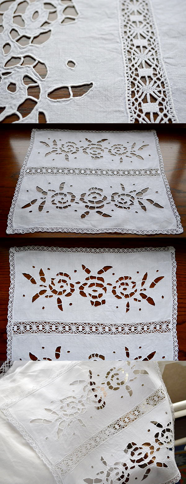 細かな手刺繍にレースが素敵なアンティークリネンクロスです♪ ハンドメイドにお役立ていただいても。写真のようなほつれが若干ありますが、気にならない程度で、状態良いです。 ※軽く、漂白・洗濯済みです。