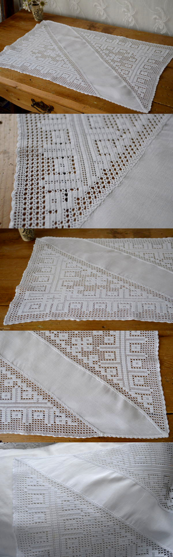 エレガントな雰囲気を演出してくれるホワイトクロスのアンティークテーブルマット。テーブルにも、チェストにも。。。♪ ※軽く、漂白・洗濯済みです。