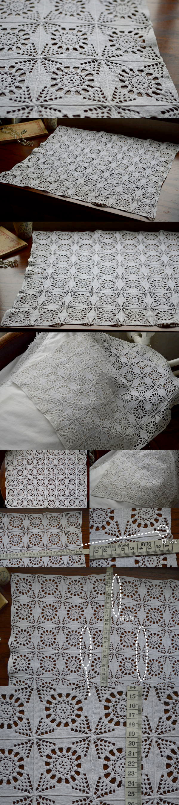 とても細かく丁寧なニードルポイントレースのパッチワーク。写真のような補修跡や薄い汚れがありますが、気にならない程度で、まだまだお使いいただきたいアンティークです♪ ※軽く、漂白・洗濯済みです。