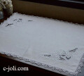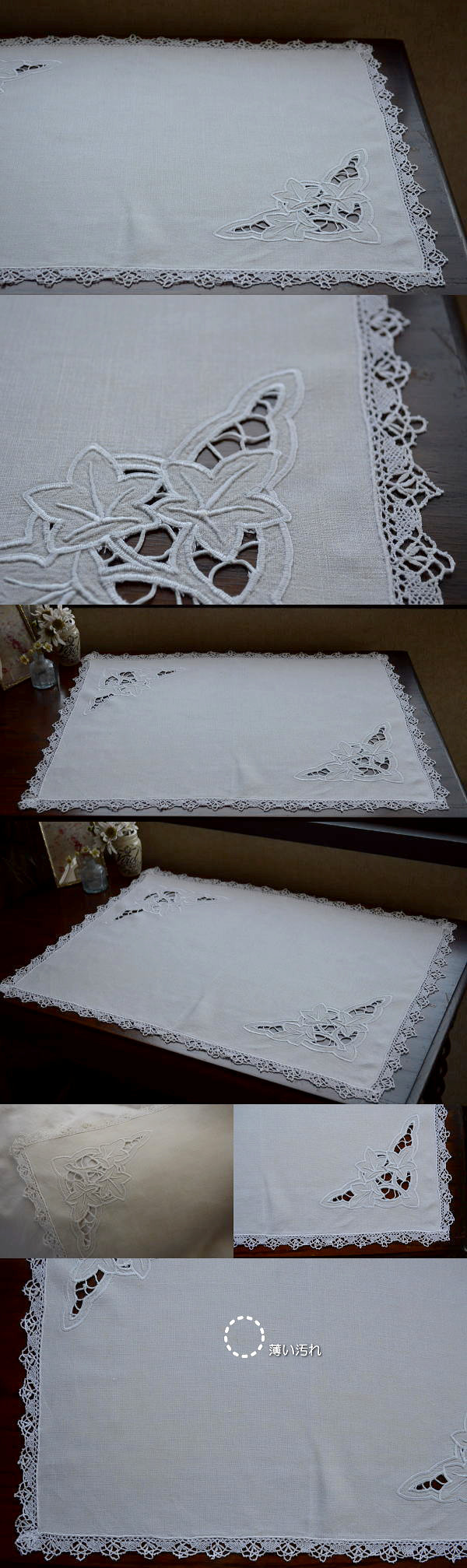 薄い生成りのベースに白のカットワーク手刺繍とエッジのレースが素敵なアンティークリネンクロスです♪ ※現地ディーラーにより洗濯済みです。