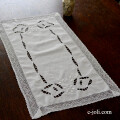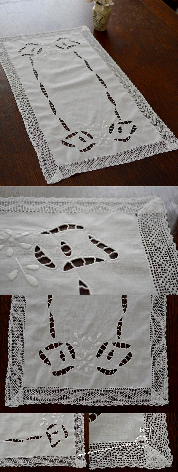 薄めの綿生地に丁寧なカットワーク手刺繍とエッジのレースがとても素敵なテーブルランナー(細長いテーブルマット)です♪ ※軽く、漂白・洗濯済みです。