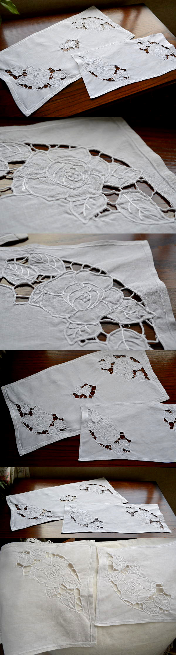 手刺繍が素敵なフレンチアンティークリネンテーブルマット。テーブルにも、チェストにも♪ ※軽く、漂白・洗濯済みです。