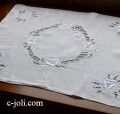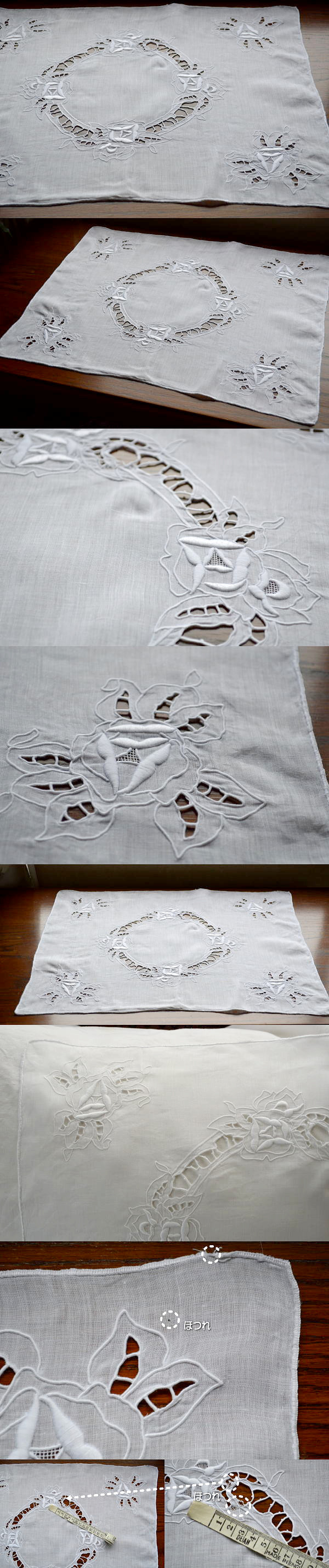 薄く繊細な綿ローン生地に、繊細なカットワーク手刺繍がとても素敵なアンティークテーブルマットです♪ フレームに入れて飾って楽しんで頂いても、実用いただいても! 写真のようなほつれがありますが、雰囲気を損なわない程度です。 ※軽く漂白、洗濯済みです。