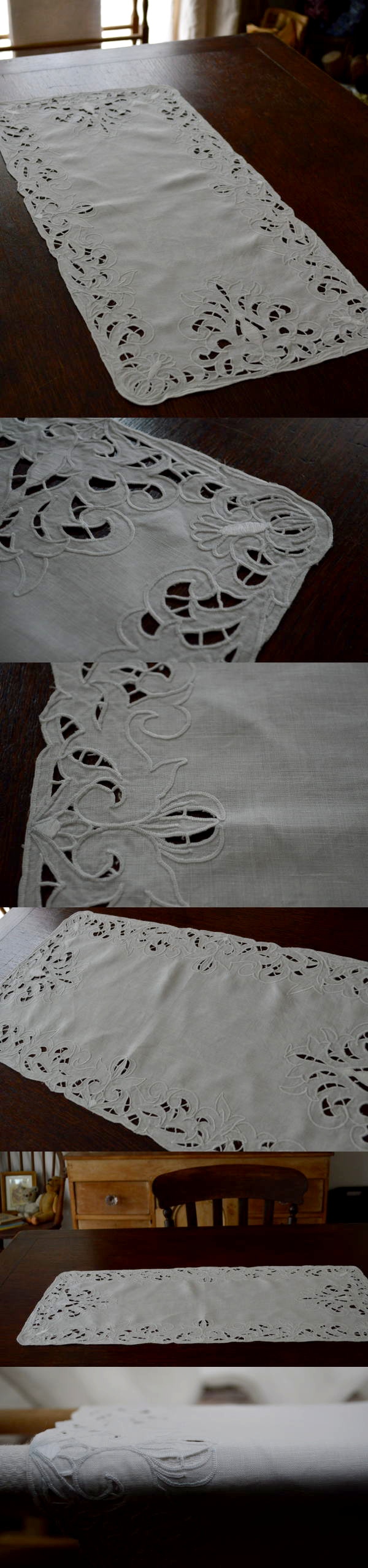 テーブルのアクセントとして気軽にお使いいただける、長細いテーブルクロスのテーブルランナー。薄く張りのある麻生地に、丁寧なカットワーク手刺繍が素敵です♪ ※軽く漂白、洗濯済みです。