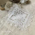 薄く上質な麻生地に丁寧なカットワーク手刺繍やボビンレースが素敵です。小さめサイズですのでドイリーとしてテーブルやチェストでお使いいただいたり、フレームに入れて飾ったり、ハンドメイドにもお役立ていただいても。写真のように薄い汚れがありますが気にならない程度です。 ※洗濯済みです。