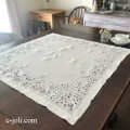 時を経て風合いを増した薄く張りのある麻生地に、丁寧なカットワーク手刺繍がとても素敵な、小さめのテーブルクロス。テーブルのセンターでお使いいただいても、カバーリングやハンドメイドにお役立ていただいても。写真のような薄い汚れが数箇所ありますが、雰囲気は良いです。 ※洗濯済みです。