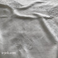気品あるダマスク織の麻生地に、丁寧な手刺繍モノグラムやボビンレースがとても素敵な、かなり大きなテーブルクロス。大判サイズなので、カバーリングやカーテンとしてお使いいただいても! 写真のような小さな汚れが、気にならない程度です。※洗濯済みです。