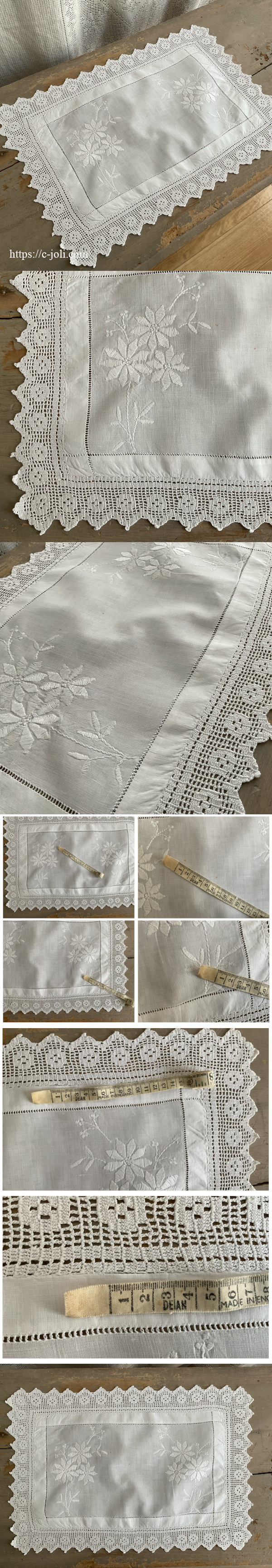 花の刺繍とクロッシェレースが静かな品を添える、イギリスアンティークのリネンクロス。刺繍はマシーンによるもので、日本でお洗濯済み、写真のように点状の跡や薄い汚れがあります。また、写真一番下のようにほつれが一部見られますが補修いただけるものです。
