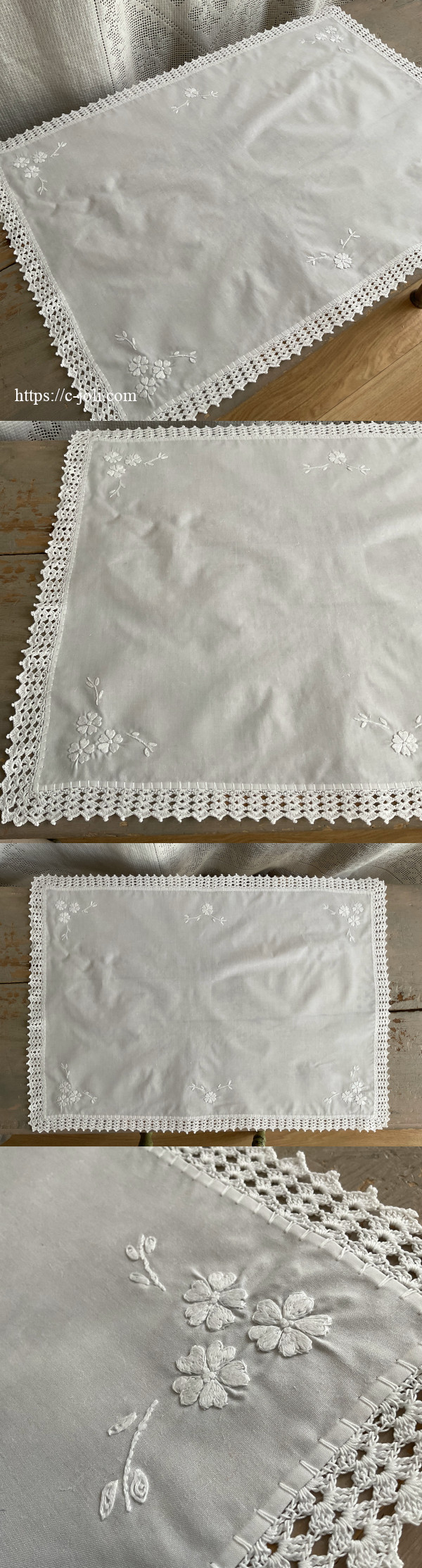 四隅に小花の刺繍を散らし、クロッシェレースで縁取ったイギリスアンティークのリネンクロス。マシーン刺繍によるもので、日本でお洗濯済み、きれいな状態が保たれています。