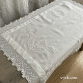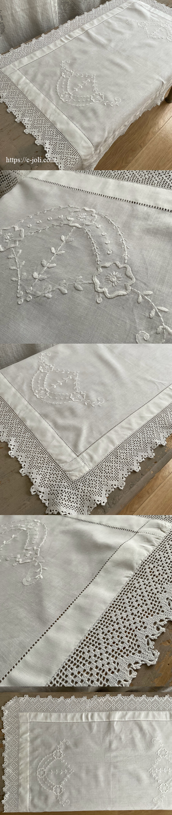 手刺繍の花模様とクロッシェレースをあしらった、イギリスアンティークのコットンテーブルクロス。テーブルに取り入れやすいサイズで、日本でお洗濯済みの良好な状態です。